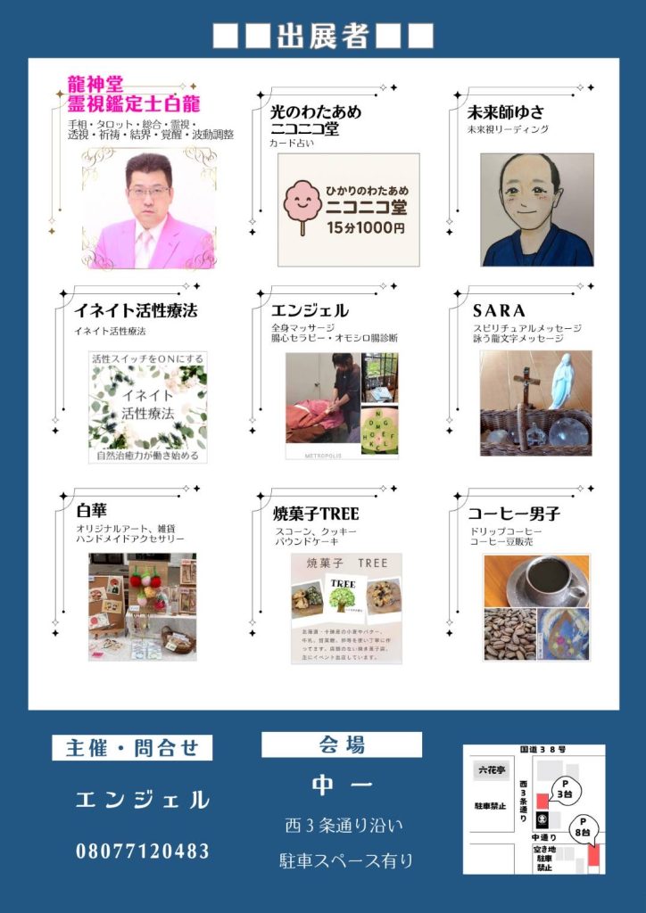 今回も霊視鑑定をはじめ、占い、未来視リーディング、マッサージ、コーヒー、焼菓子などを用意してお待ちしております。