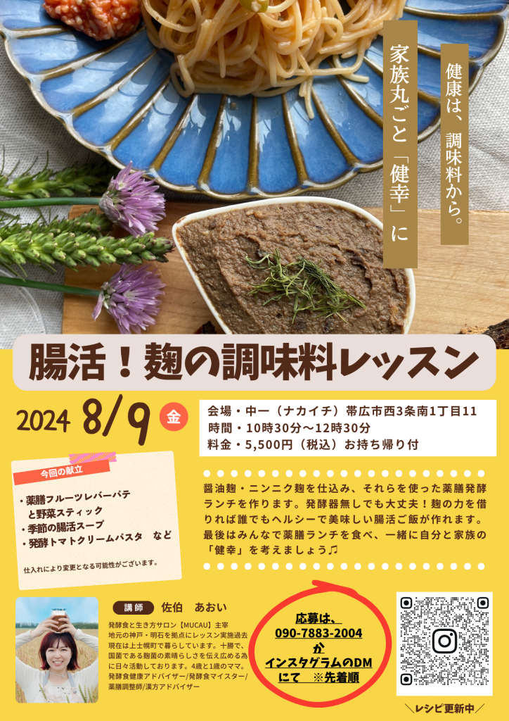 ※参加希望者はInstagramよりDMを送るか、mucau.salon2024@gmail.comまで「8/9腸活レッスン参加希望」とメールをお送りください。