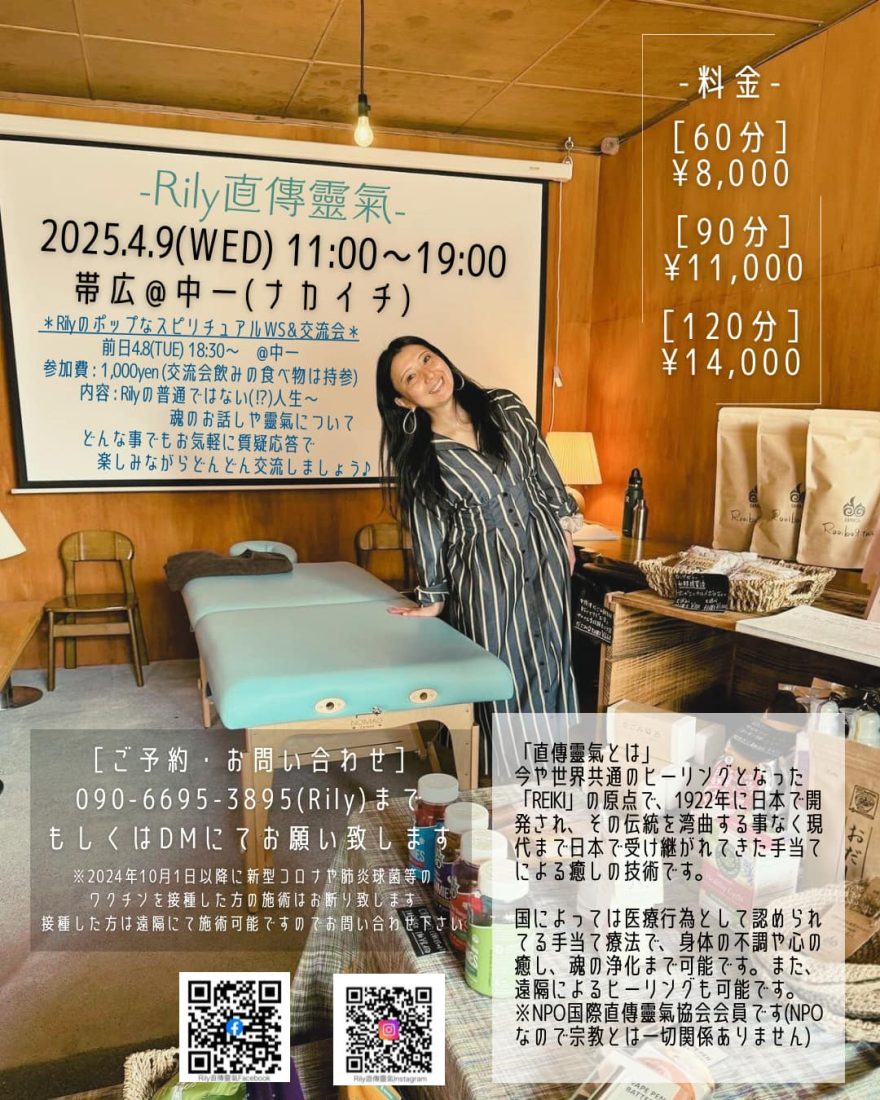 【終了】直傳靈氣施術 2025.4.9(火)11:00-19:00 @シネマスペース *8日18:30~RilyのポップなスピリチュアルWS & 交流会